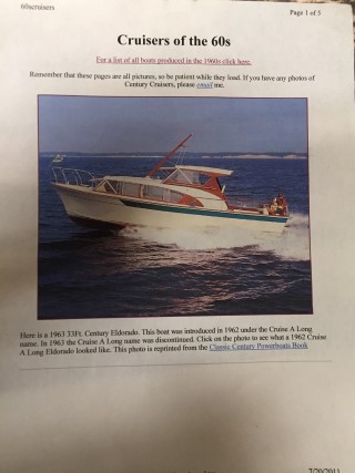 Century purchased the Cruise Along Boat Co of Solomons, Maryland around 1962 to enter the big boat market. It was an old brand with an old shipyard. Needed lots of updating. The Century owner, Mr. Hewitt poured a bunch of money into it, culminating in his dream boat the 45' Motor Yacht. The El Dorado 33 was made in 1963 and 1964. By 1966, Century pulled the plug on Solomon's boat yard.
